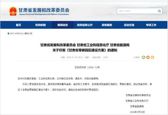 2026年1月30日,甘肅省發展和改革委員會、甘肅省工業和信息化廳、甘肅省能源局發布關于印發《甘肅省零碳園區建設方案》的通知(甘發改環資〔2026〕51號)。