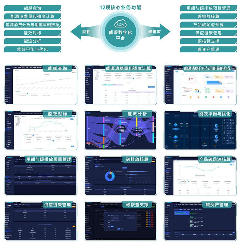 1. 數字化能碳管理系統平臺是支撐工業企業和園區提升能耗雙控和碳排放雙控管理水平的信息系統,是加強工業節能降碳管理,推進數字技術賦能綠色低碳轉型的基礎工具。可支撐企業申報綠色工廠和零碳園區,滿足《工業企業和園區數字化能碳管理中心建設指南》中十二項功能,即能耗查詢、能源消費量和強度計算、能源消費分析與用能策略推薦、能效對標、能流分析、能效平衡與優化、用能與碳排放預算管理、碳排放、碳足跡核算、供應鏈碳管理、碳核查支撐、碳資產管理等功能。