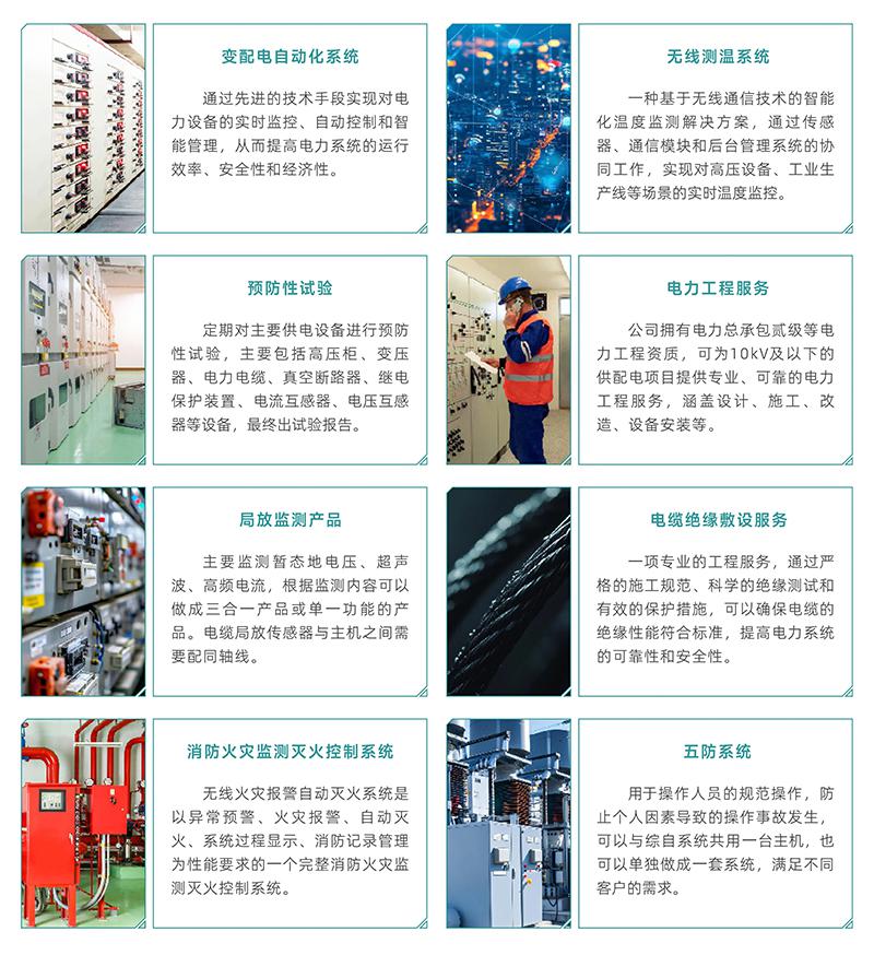 電力綜合服務聚焦電力系統全生命周期保障:以變配電自動化系統提升設備運維效能,通過無線測溫、局放監測產品精準掌握設備狀態,輔以核心設備預防性試驗提前規避故障,同時提供電力全鏈條工程服務,并配套電纜絕緣敷設、消防火監監測滅火控制系統、五防系統構建全場景安全防護,全方位支撐電力系統安全、高效穩定運行。